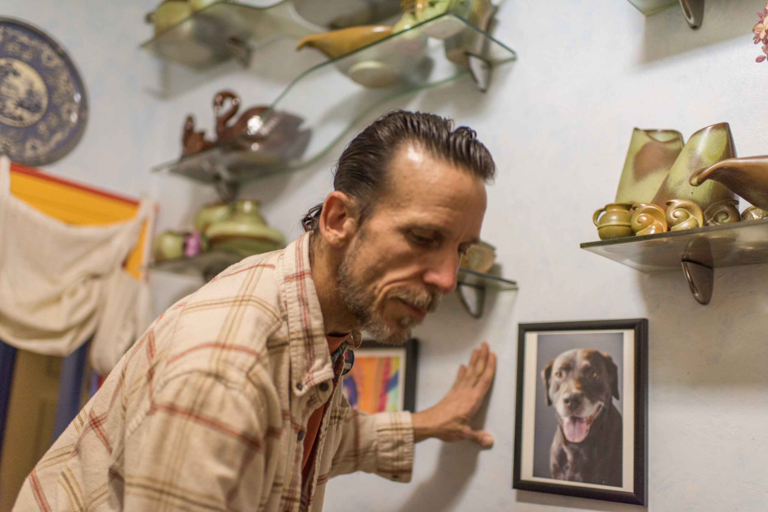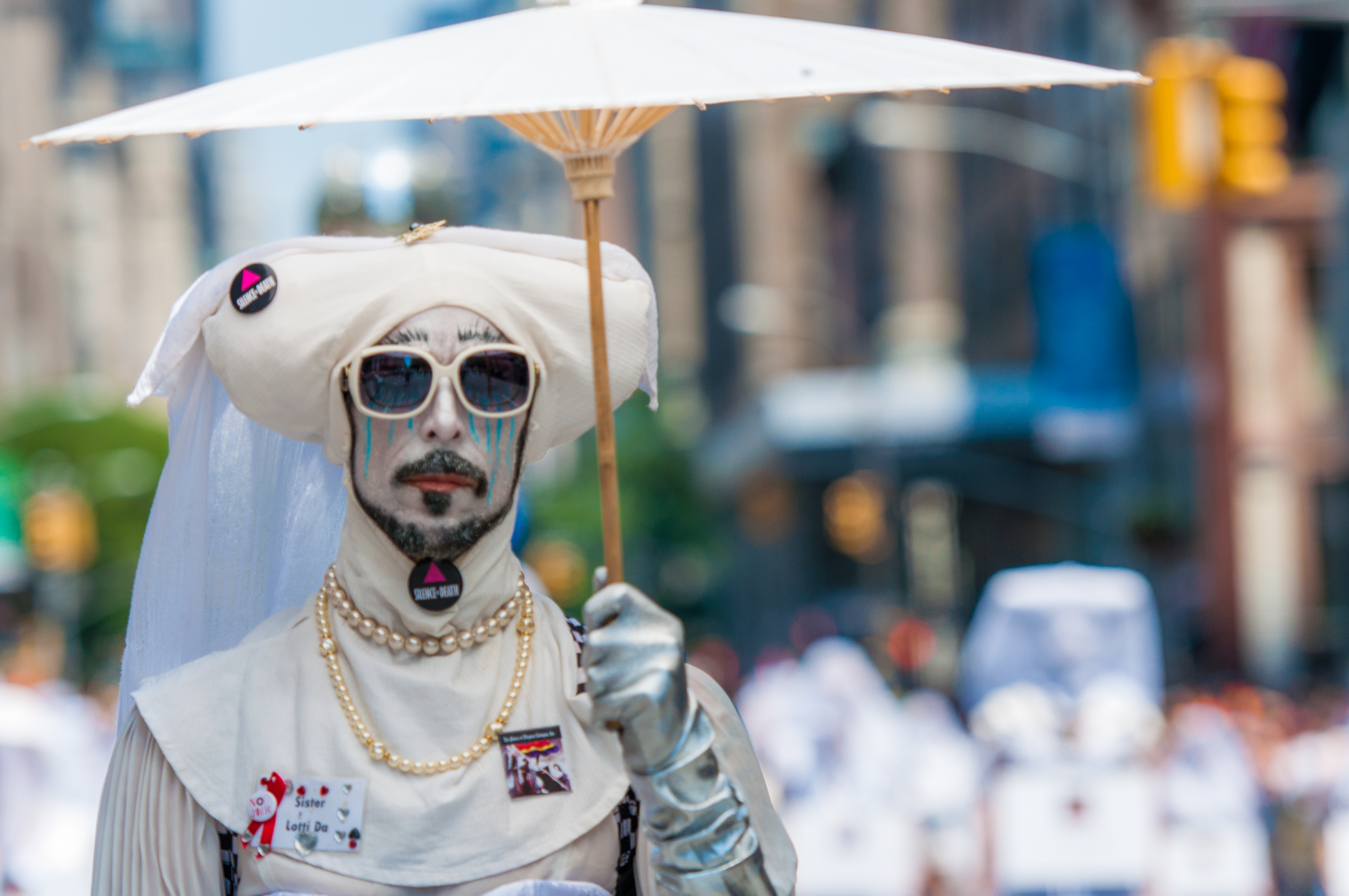 The first time I saw Hucklefaery I was photographing the Pride March which took place shortly after the Pulse Nightclub shooting that had happened in Orlando earlier this year. The shooting was a large part of the theme of the march, however there was one tribute that stood out from all of the other groups that day. They called themselves 49 Human Beings, after the number of those that were lost in the Pulse shooting. They dressed in white, with veils covering their faces, and silently proceeded down the parade. On each of their chests there was a placard with the photograph, the name, and age of each of the victims of the Pulse shooting. Hucklefaery was leading the procession dressed as Sister Lotti Da; umbrella in hand, dark sunglasses with white rims, a white victorian girdle, white make-up and blue tears streaming down his face. I met him again as Sister Lotti Da, while I was photographing the AIDS memorial park dedication in St. Vincent’s Triangle in New York. Again, he had a white painted face, but this time it was accented with red and he had an outfit to match. When I went to interview him at his home I wasn’t quite sure what to expect because I’d never seen him outside of the persona of Sister Lotti Da. Hucklefaery is a tall man. At 6’3” he is already an imposing figure, however when he dresses as Sister Lotti Da and puts on five inch heels and a six inch wimple he is impossible to ignore. This is how he delivers his message, a message of awareness about the gay community and the issues they face. Issues such as violence, stigma, marginalization and access to healthcare. He feels that Sister Lotti Da is a celebratory figure which makes his message accessible. This delivery is a cross between protest and art, activism and education.